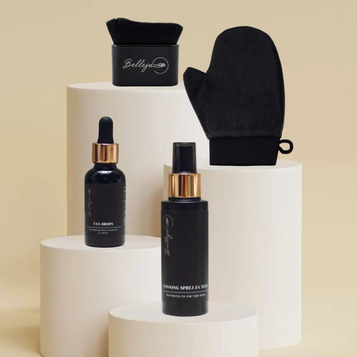 Belleja osnovni set za naravno porjavelost je idealen komplet za vse, ki želite enostavno in učinkovito doseči brezhiben porjavel videz – na obrazu in telesu. Paket združuje vrhunski samoporjavitveni serum in meglico z dvema ključnima pripomočkoma za nanos: Kabuki čopičem in rokavico za telo.